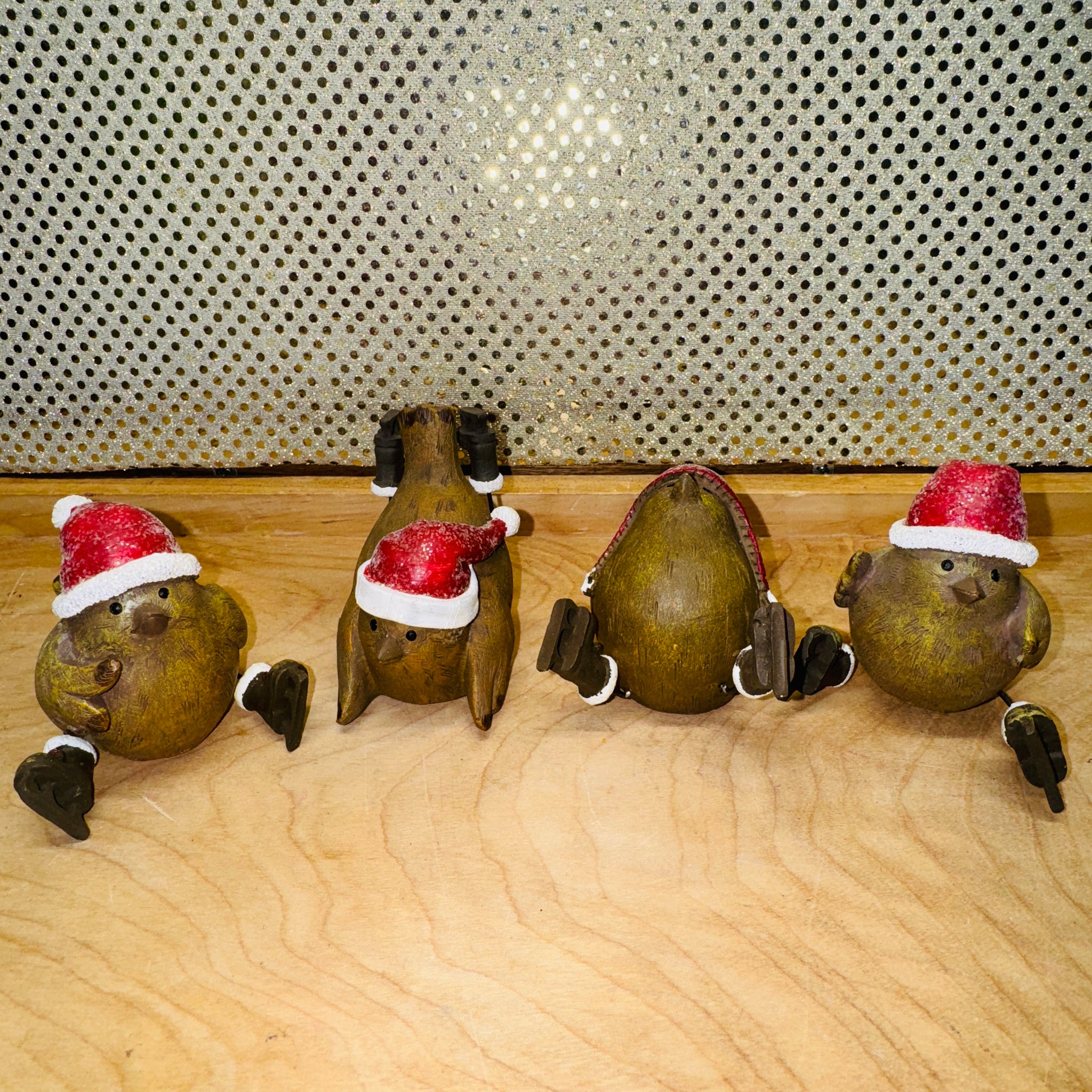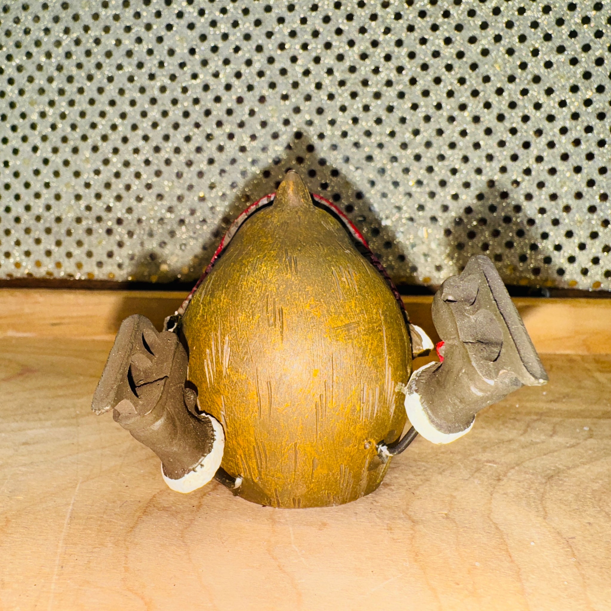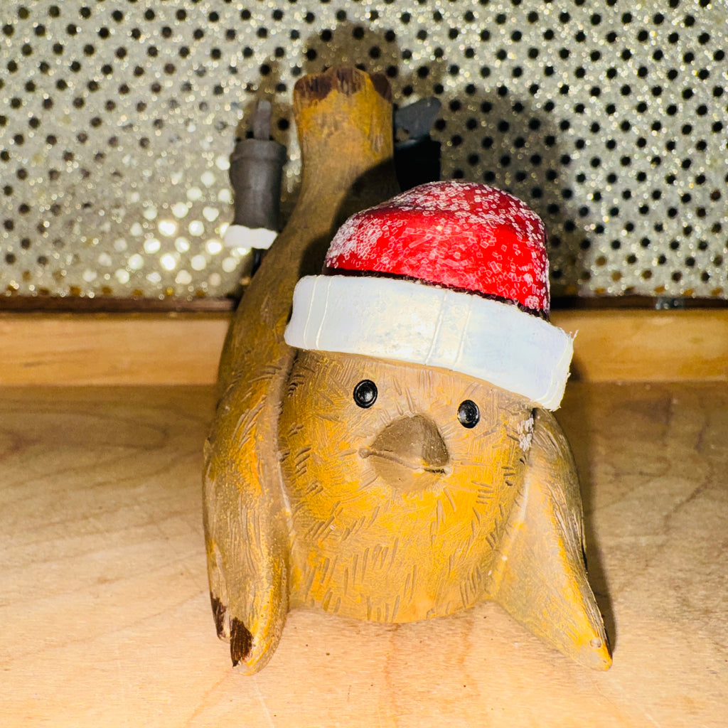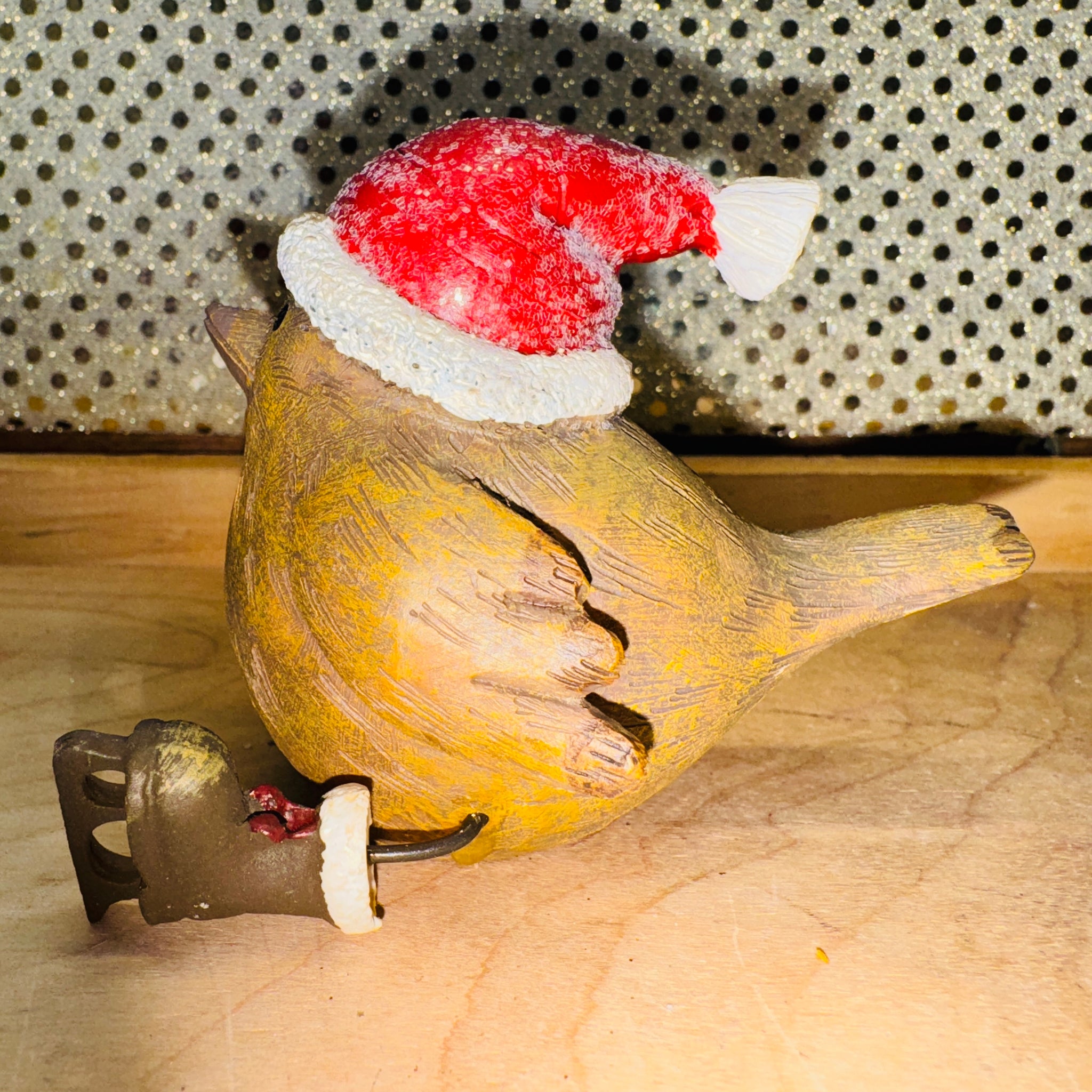 Bird with red hat and pom wearing ice skates. Cute on a side table, windowsill or shelf