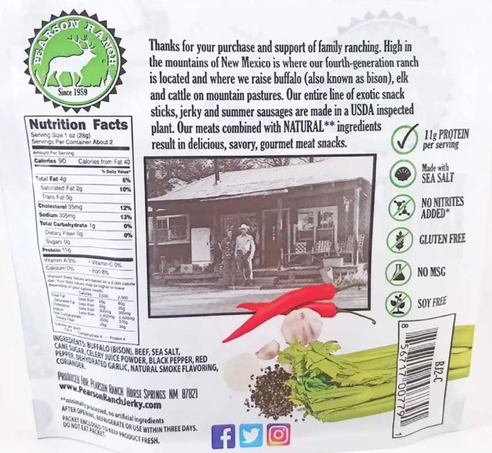 2.1 ounces. Low-fat. 11 grams of protein per serving. All-natural. Perfectly seasoned. Bite-sized buffalo. Your new favorite snack. Pearson Ranch Jerky’s buffalo jerky bags are better than anything you could dream of. And just in case you can’t finish off the bag in one sitting, it's resealable. And for good measure, it’s also MSG-free, gluten-free, and contains no added nitrites.