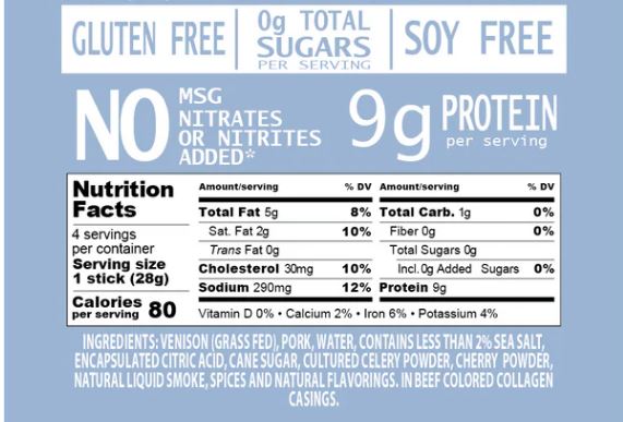 Delicious and lean, Pearson Ranch used the same seasoning in our venison snack sticks as they did in their flagship jerky products. Hickory smoked and delicious, this low-fat, low-carb, high-protein snack stick is likely to be one of the healthiest things you’ll eat all week. These 4 piece, 1 oz snack sticks are all-natural, MSG-free, gluten-free, and contains no added nitrites.
