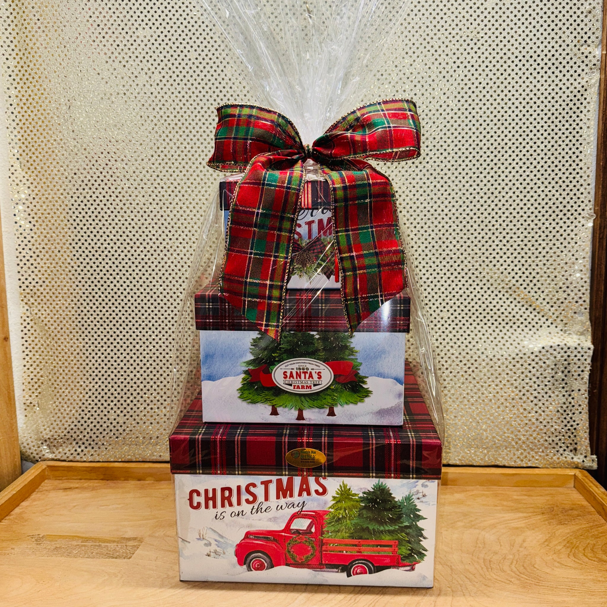 XL square shaped boxes hold enough goodies for a week for an entire family. This set features the Classic Red Truck with Christmas Trees.