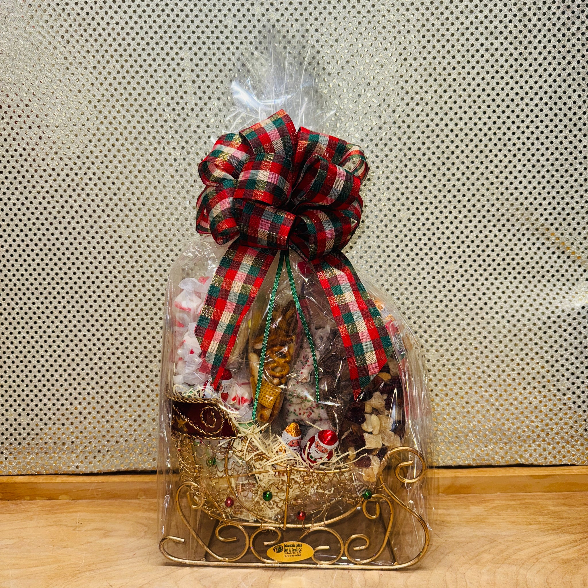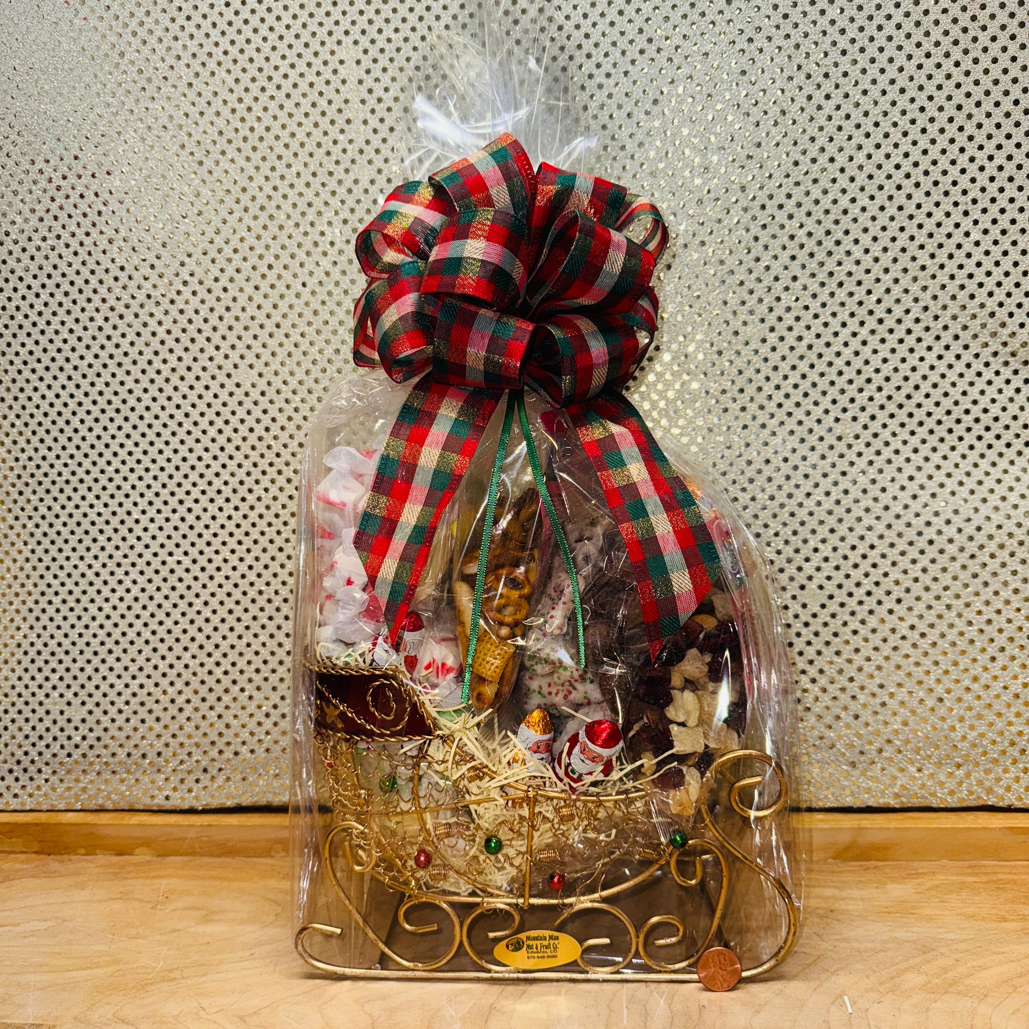 Give the gift basket that keeps giving! Not only will your recipient receive a beautiful sleigh full of yummy goodies but this gold wire sleigh is timeless! It can be used over and over again during the holiday season for so many different uses!