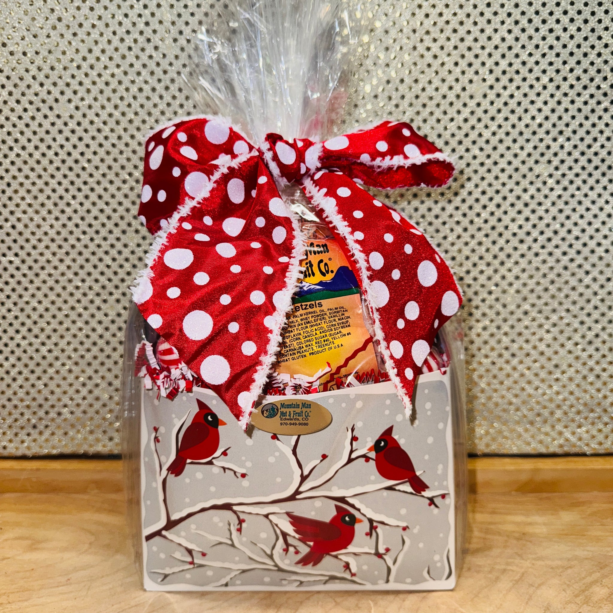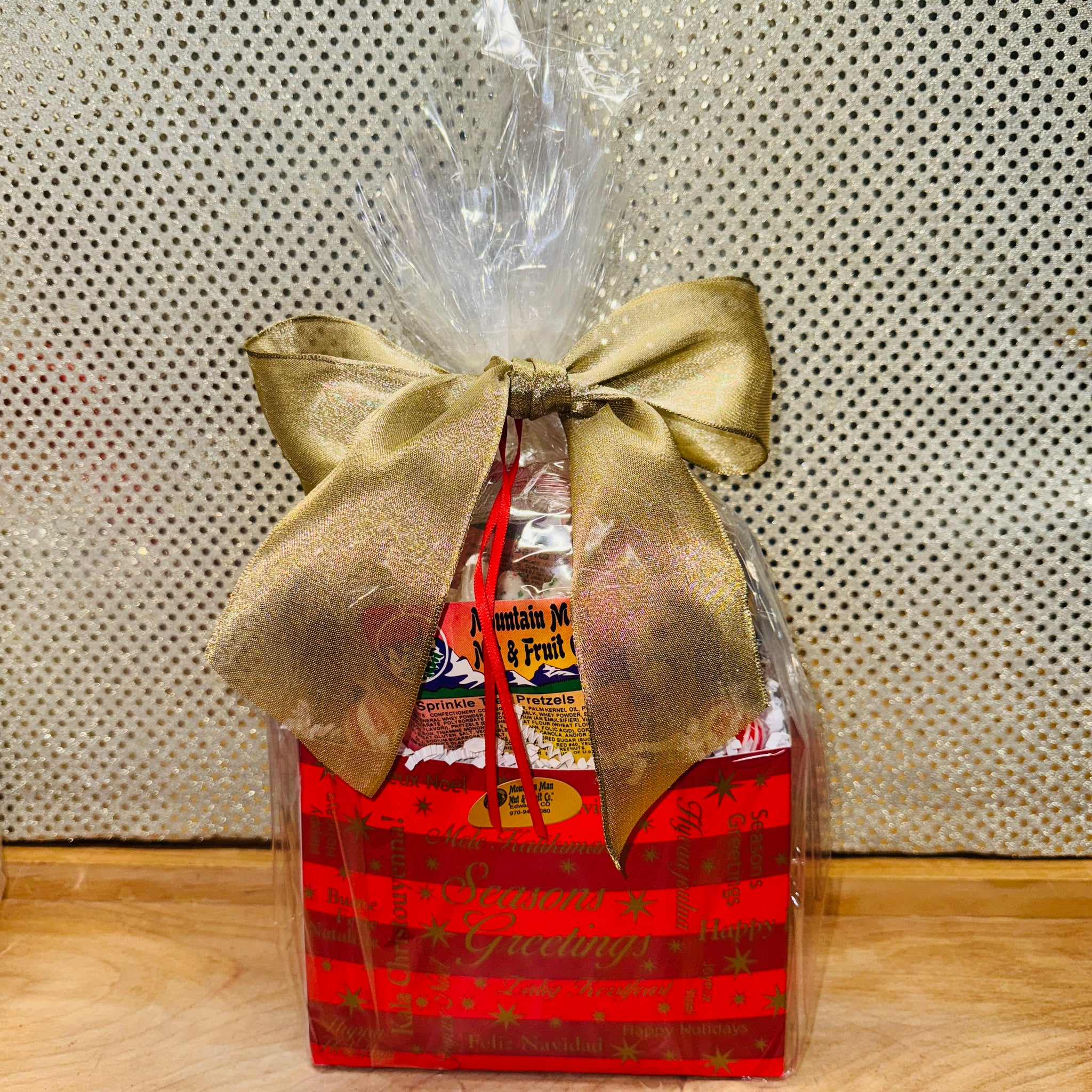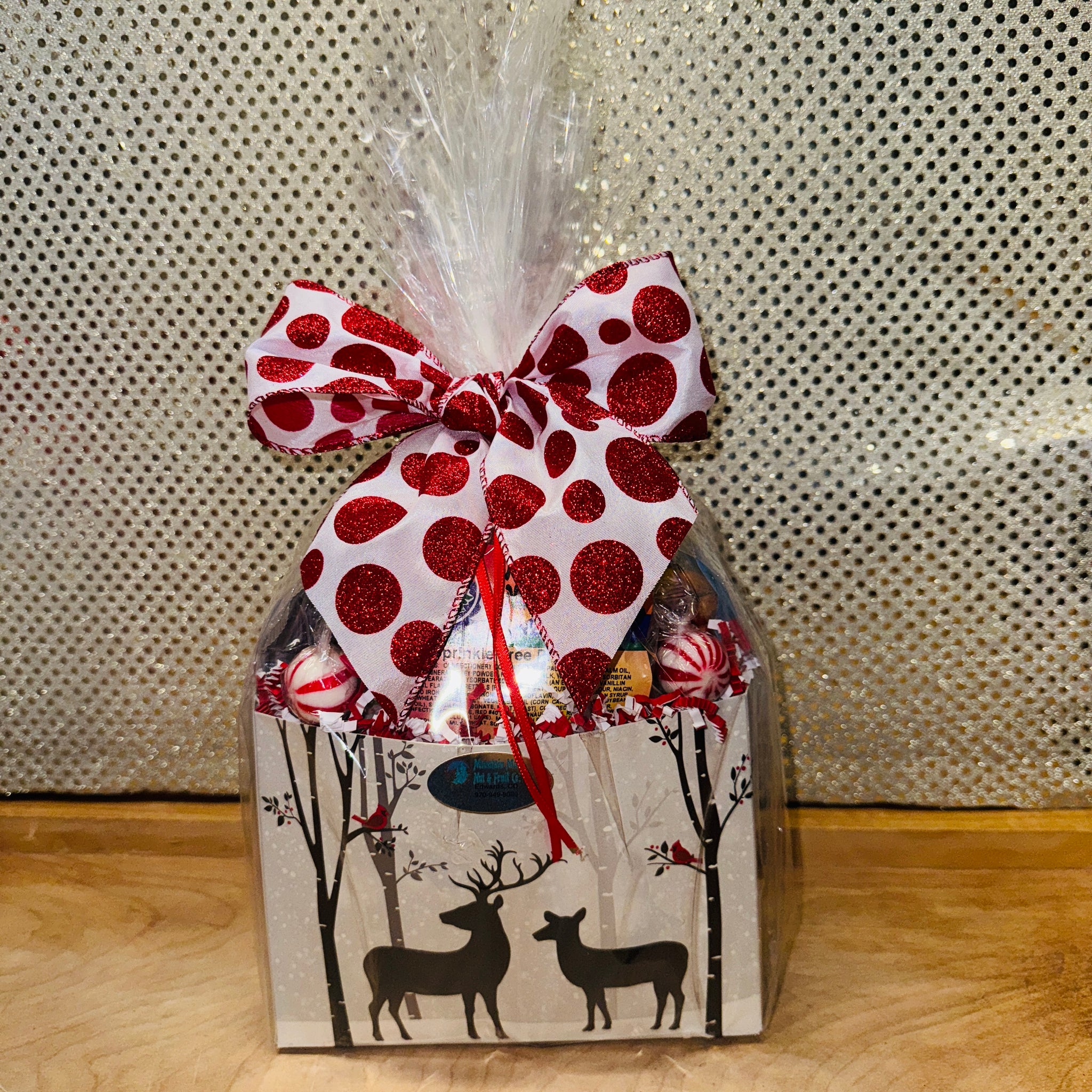 This basket is put together using on of our holiday small basket boxes with grass and a tie bow. If you have a favorite small basket box of the many many many that we have and would rather use, please let us know!