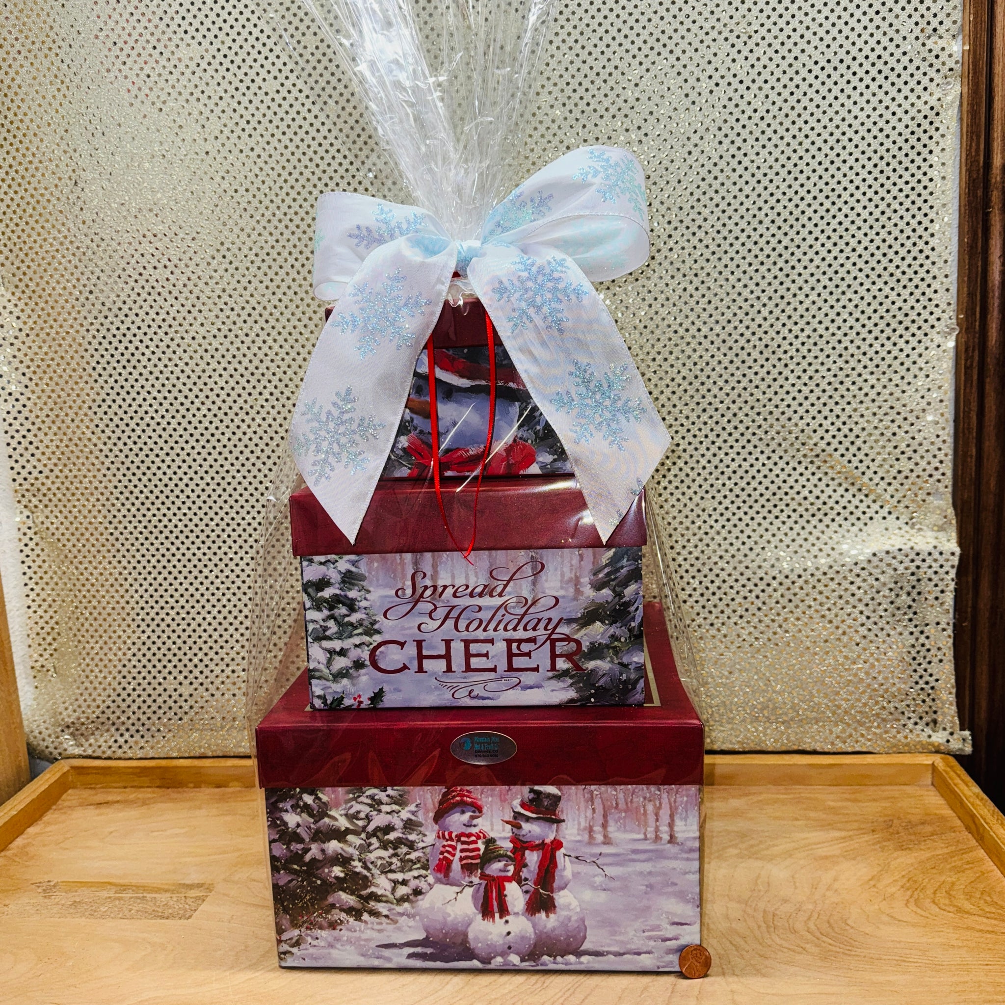XL square shaped iconic boxes hold enough goodies for a week for an entire family. This set features a Snowman Family in a wintery scene.