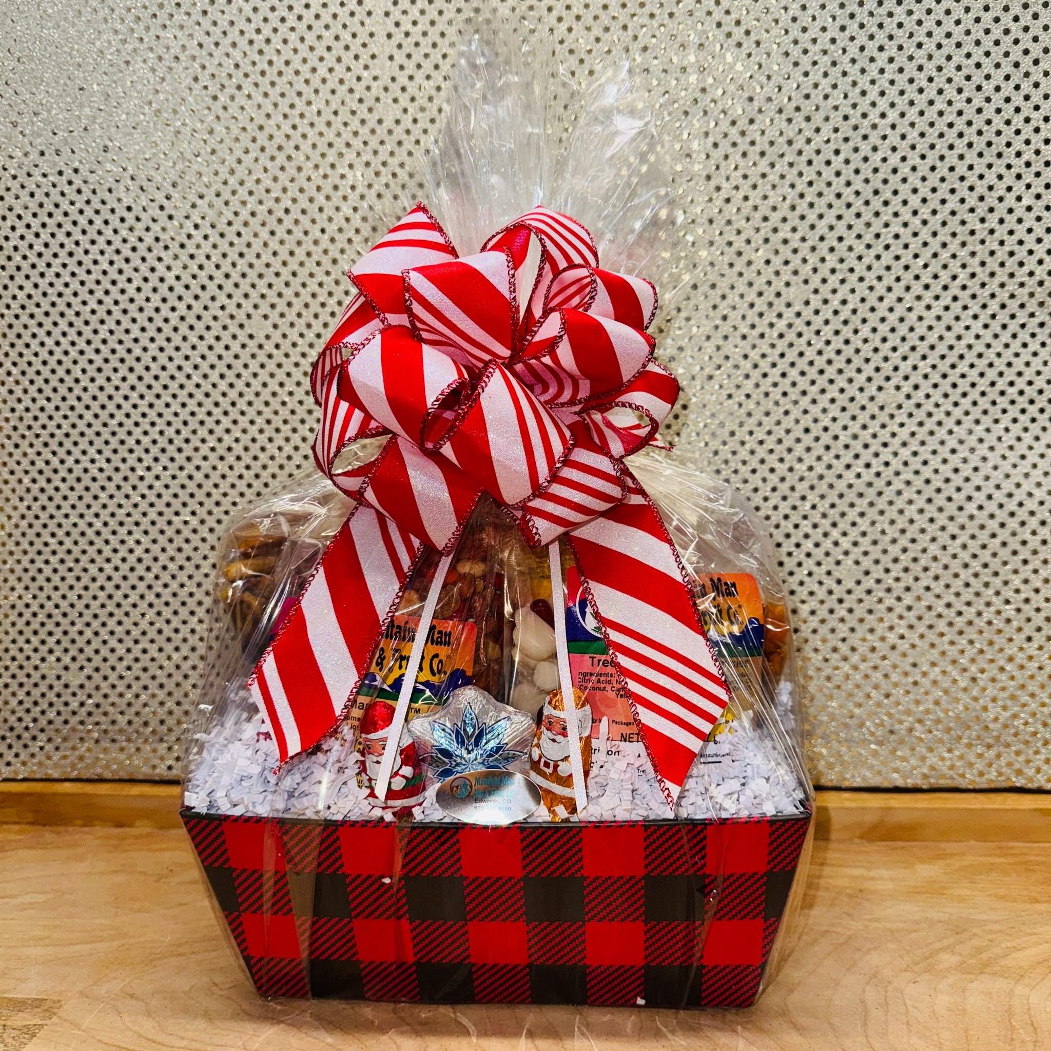This basket is assembled using a holiday-themed small market tray, then we add grass, cello and a 10 loop bow.