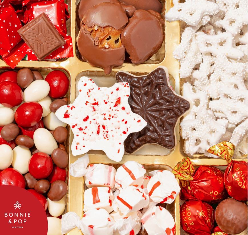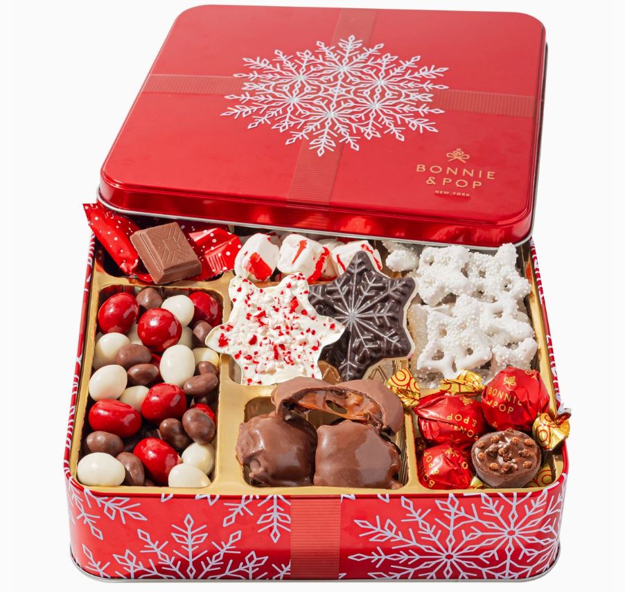 Contents Snowflake Shaped Peppermint Bark, Yogurt Snowflake Pretzels, Hazelnut Chocolate Bon Bons, Cashew Clusters, Pecan Snappers, Peppermint Salt Water Taffy, Milk Chocolate Hazelnut Squares and a Bridge Mix combining: Chocolate Covered Cherries, Chocolate Covered Peanuts, Chocolate Covered Raisins, and Yogurt Covered Almonds. Contents are individually bagged.
