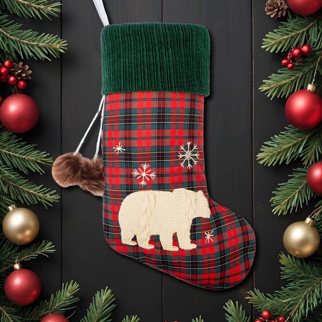 Crafted with a timeless red and green plaid base, these stockings embody the classic Christmas color palette. The deep green fuzzy cuff adds a luxurious touch, providing a plush frame to the central silhouette of each stocking. The silhouettes, rendered in a soft, off-white hue, depict either a bear or elk, each cut out with precision and appliqued onto the stocking for a charming, three-dimensional effect. The silhouettes are further enhanced by delicate snowflake embroidery around the edges, adding a touch of wintry elegance. The intricate stitching details the snowflakes, creating a beautiful contrast against the plaid background and drawing attention to the central figures. A pair of brown furry balls dangle from the cuff of each stocking, adding a playful element and a tactile delight.