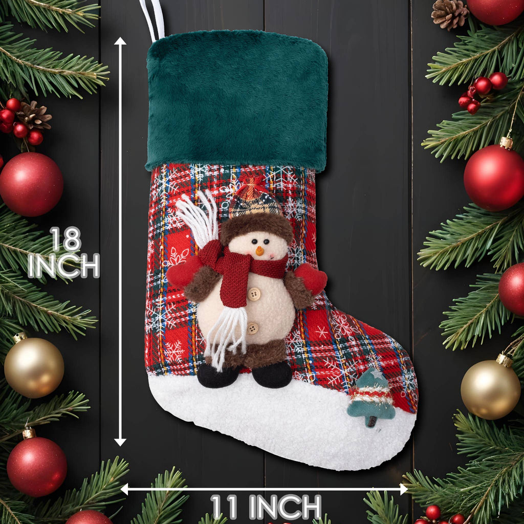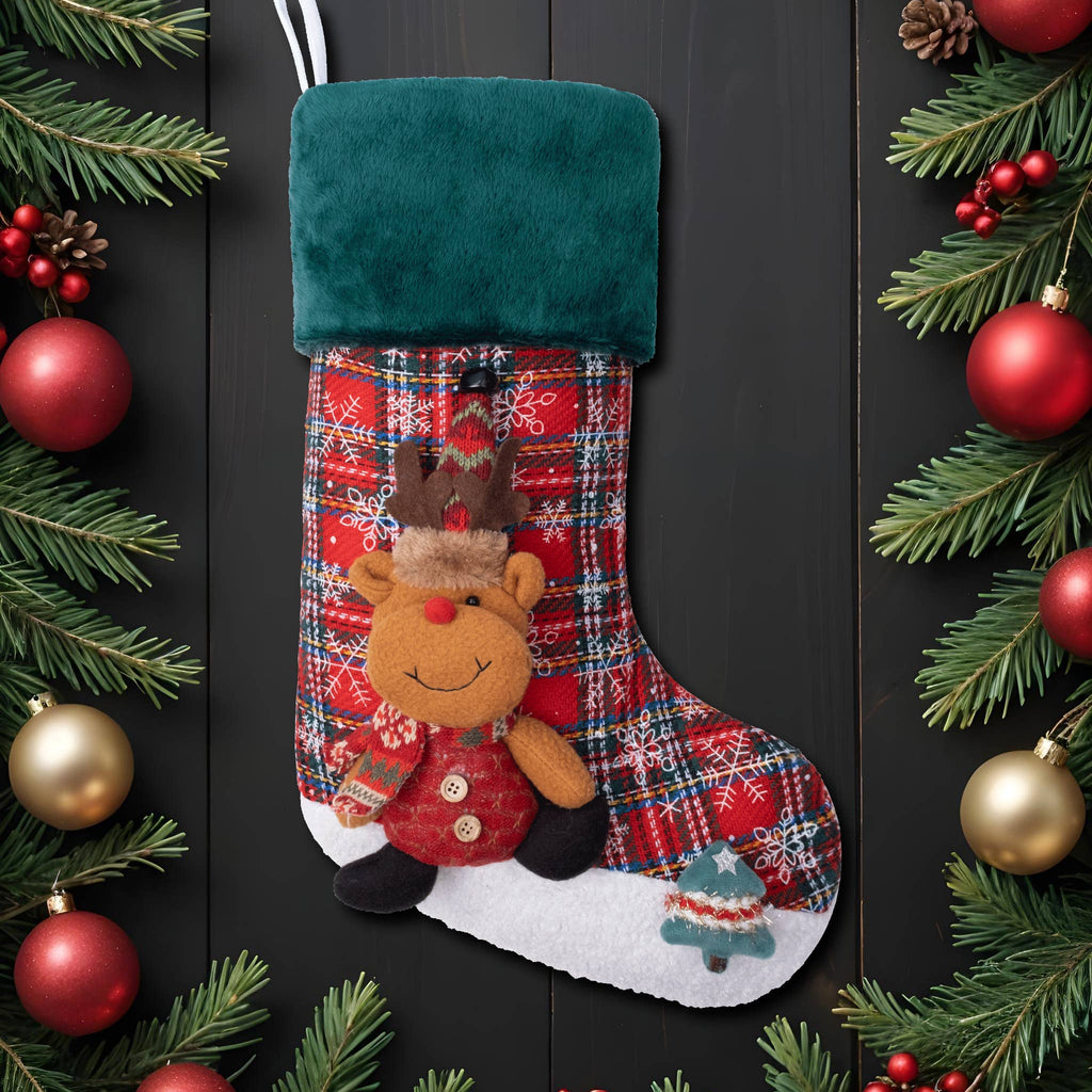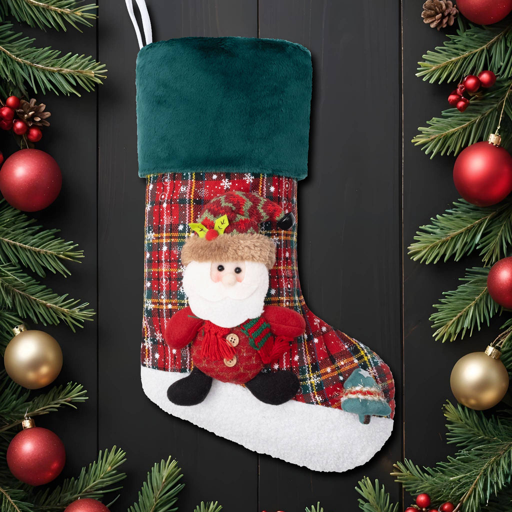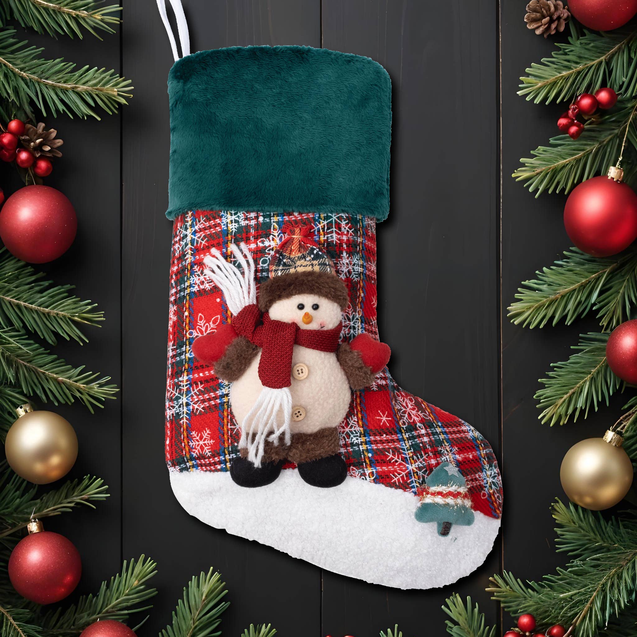 Add a touch of festive charm to your holiday decor with our exquisitely embroidered Christmas stockings. Each features a classic red and green plaid design and a deep green plush cuff for a cozy feel. The highlight is the adorable 3D figurine at the center—choose from a snowman, Santa Claus or a reindeer. With six unique styles available individually, these stockings are perfect for creating a delightful holiday scene.