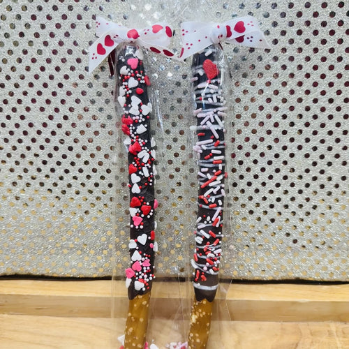 Handcrafted. Dipped in gourmet confectionery dark chocolate Decorated with premium sprinkles and vanilla candy drizzle. Each rod wrapped in crystal-clear plastic bag and twist+bow tie for freshness.